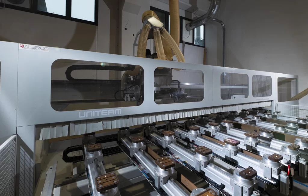 I flussi dei materiali di magazzino sono gestiti tramite tablet e la falegnameria industriale lavora con macchinari a controllo numerico dove ogni singolo pezzo è codificato con codice a barre.